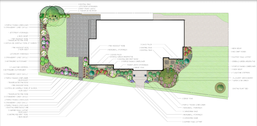 These designs include every element of your landscape plan, from your home and garage to patios, walkways, and property lines. Each plant is represented by a unique symbol, and if the same plant appears in multiple locations, that same symbol will be used each time. This makes it easy to visualize the layout and understand where everything will go, especially in larger projects with numerous plants and features.