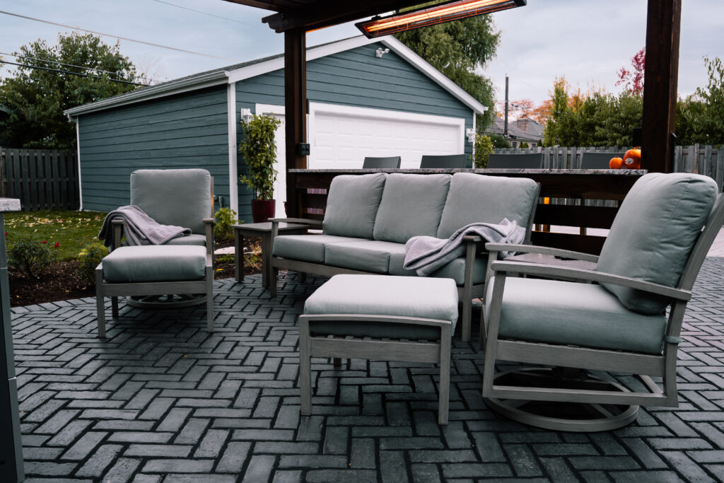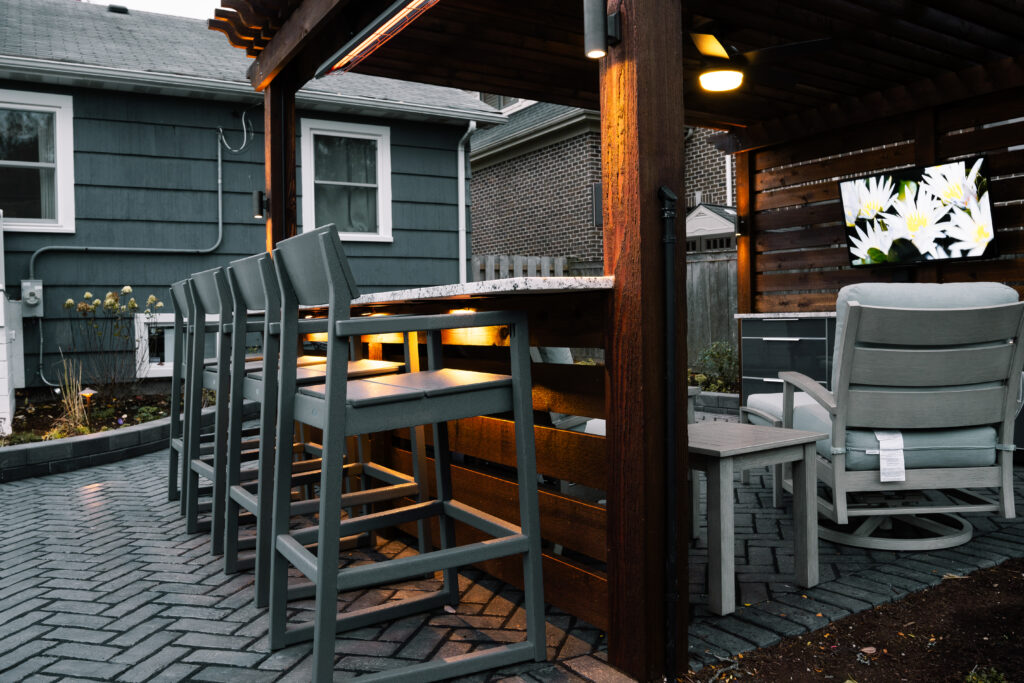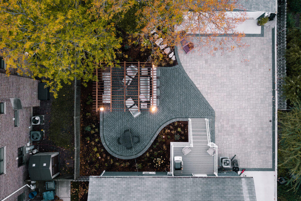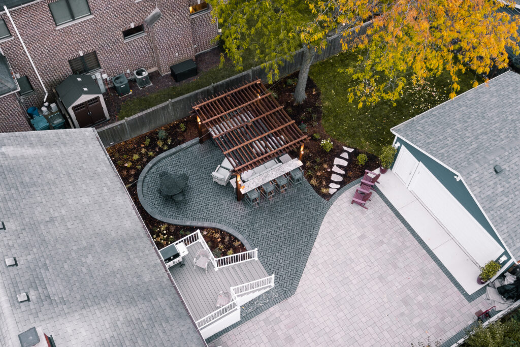 This backyard originally had an aging deck and very little usable space for lounging or entertaining. After the new garage and expanded driveway were completed last year, the property was ready for an outdoor space that tied everything together. The new design features a composite deck, a patio that seamlessly connects to the driveway, and a pergola built for hosting.